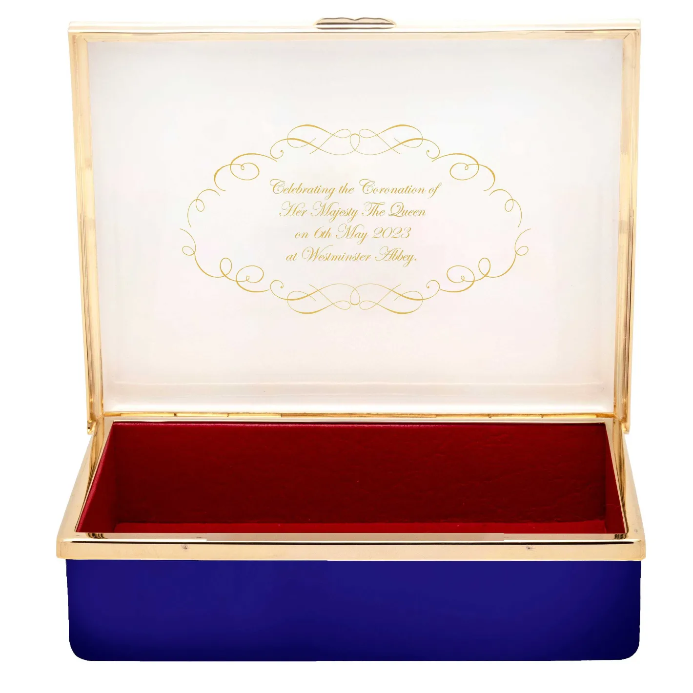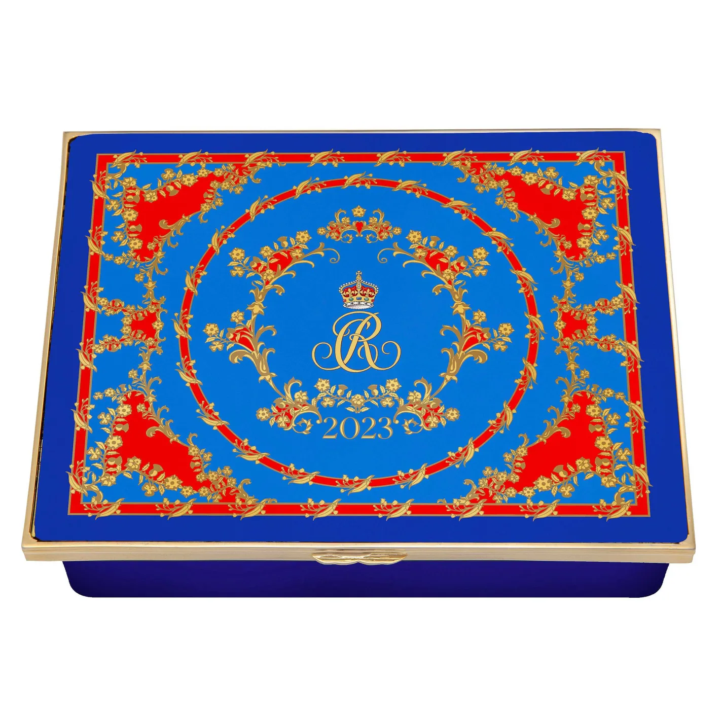 This Beautiful Collection Has Been Specially Designed To Honour And Celebrate Her Majesty Queen Camilla. Each Piece Depicts The Four Flowers Of The Realm In Gold: Roses, Thistles, Daffodils, And Clover, As Well As Lily Of The Valley. The Floral Scroll Detail Is Complemented By A Patterned Cerulean Blue And Red Background, All Of Which Surrounds Her Majesty’S Royal Cypher And The Year Of The Coronation.