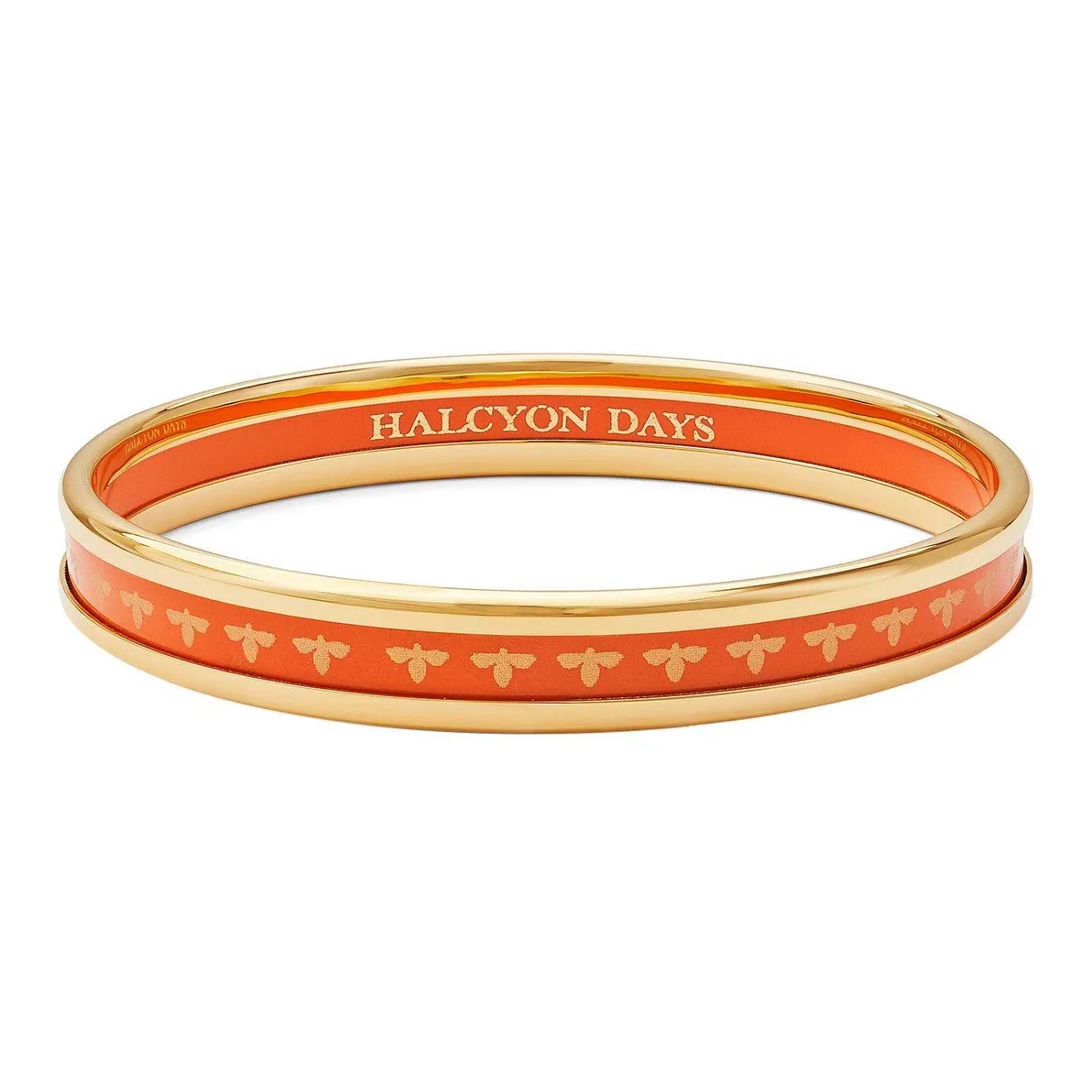 Crafted From Brass And Plated In 18Ct Gold, This 6Mm Skinny Bangle Features Honey Bee Silhouettes With Orange Enamel Base. It Slides Easily Over The Wrist Which Can Be Stacked In Style Or Worn On Its Own.