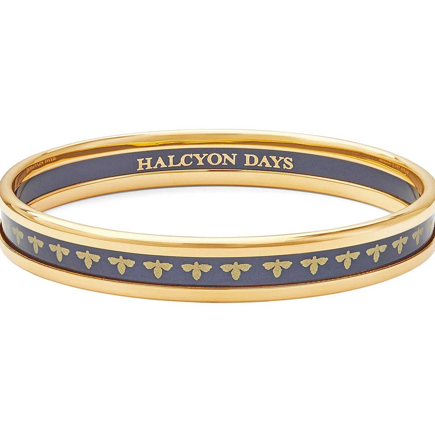 Crafted From Brass And Plated In 18Ct Gold, This 6Mm Skinny Bangle Features Honey Bee Silhouettes With Navy Enamel Base. It Slides Easily Over The Wrist Which Can Be Stacked In Style Or Worn On Its Own.