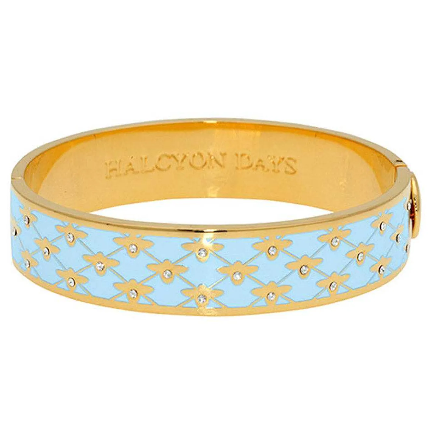 This Hinged Bangle Is Crafted From 18Ct Gold Plated Brass And It Boasts A Design Inspired By The Buzzing Of Bumblebees Around Blooming Flowers. Its Floral Forget-Me-Not Base Colour Is Complimented By Trellis Pattern And Glass Crystal Bejewelled Bees.
