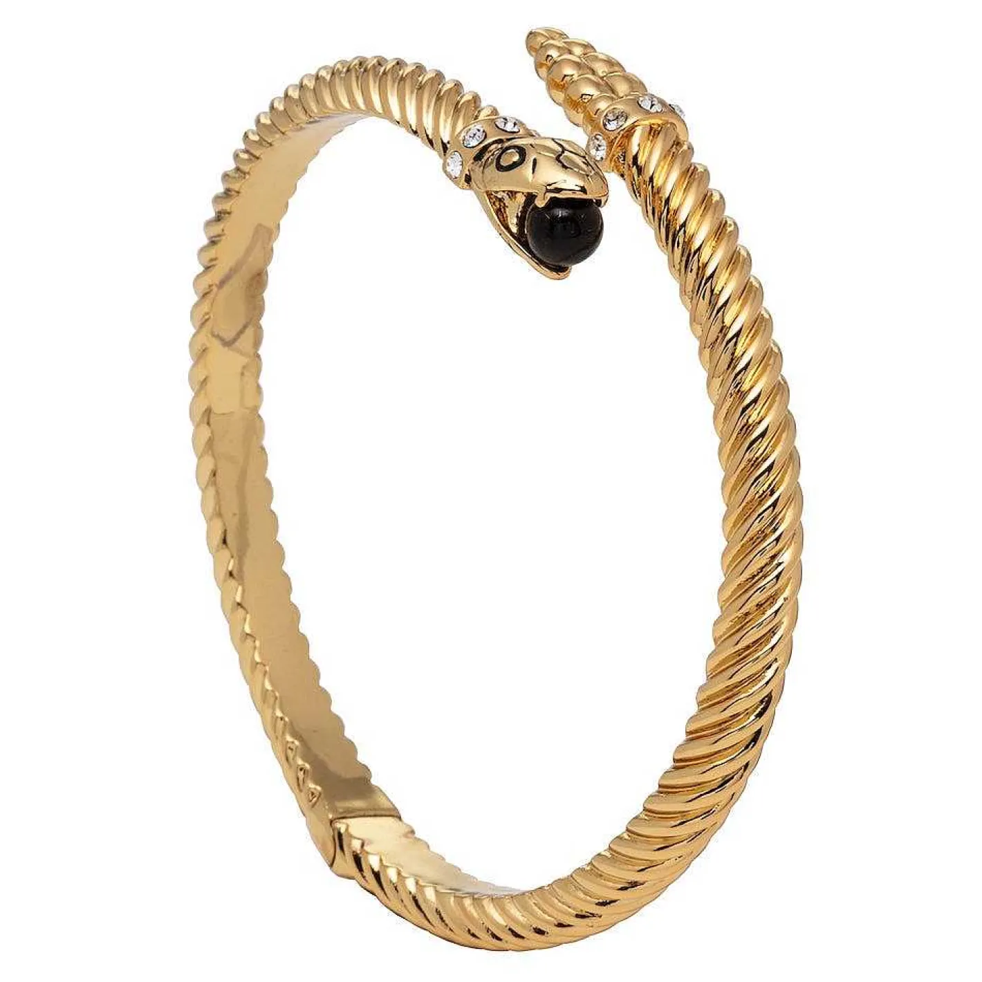 This Statement Bangle Has A Design Inspired By The Serpent’S Near Universal Presence As A Cultural Symbol. Representative Of Creativity, Rebirth, Transformation, And Healing, Our Snake Holds A Black Enamel Cabochon Locked Between Its Jaws And Is Studded With Glistening Glass Crystals.