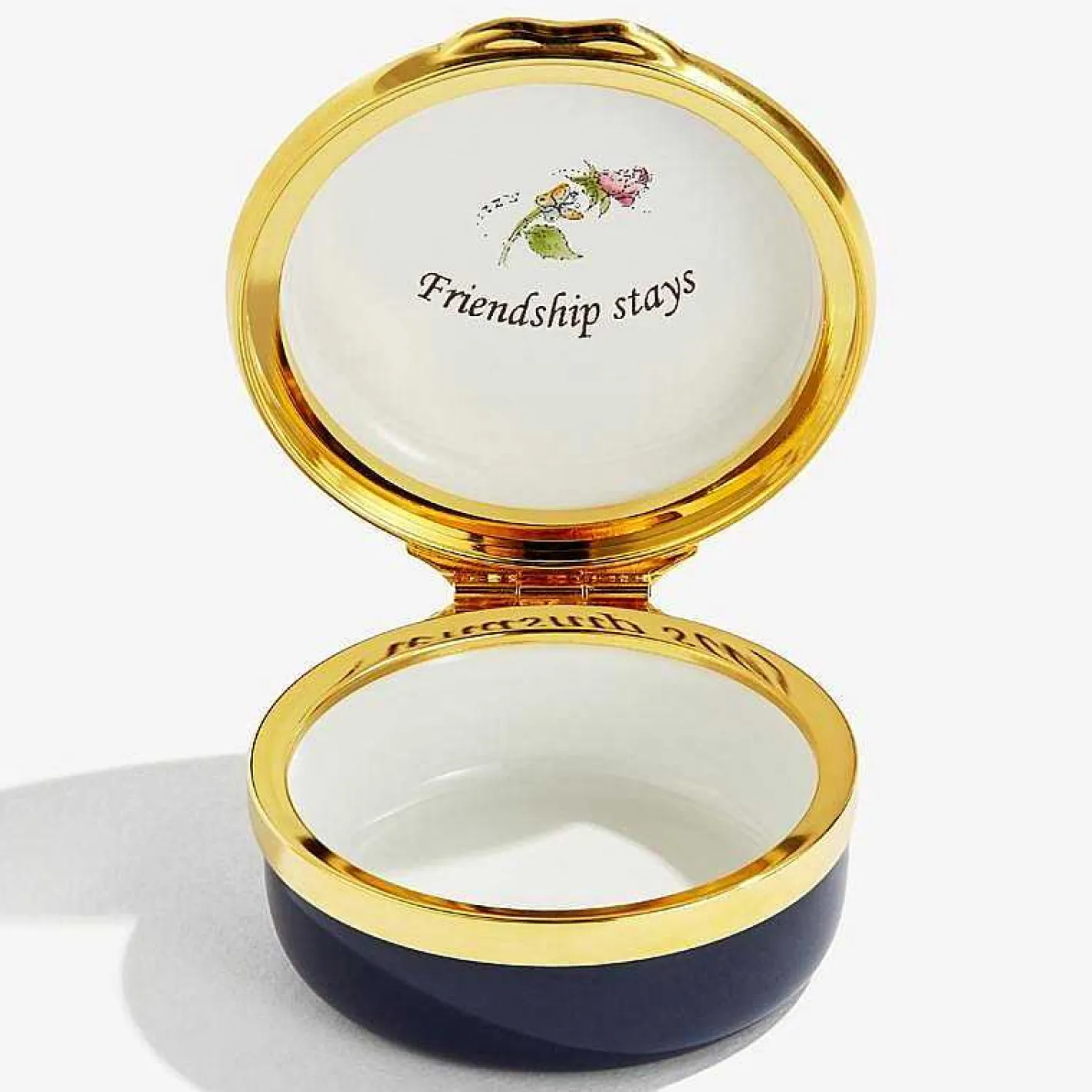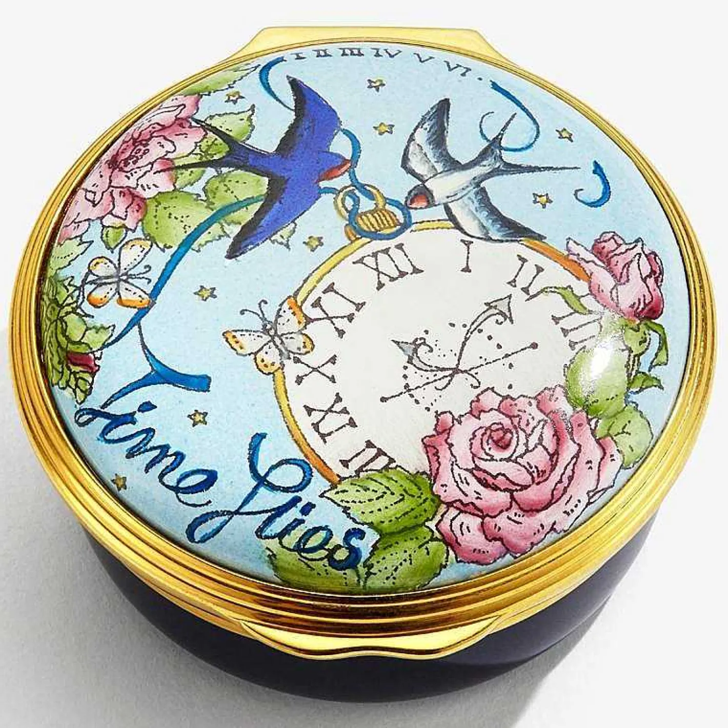 This Enchanting Enamel Box Features Hand Illustrated Birds, Red Roses And Butterflies Encircling A Clock, With The Words ‘Time Flies’ Floating In Ribbon Alongside. The Inside Lid Finishes This Heartfelt Phrase With The Inscription, ‘Friendship Stays’.