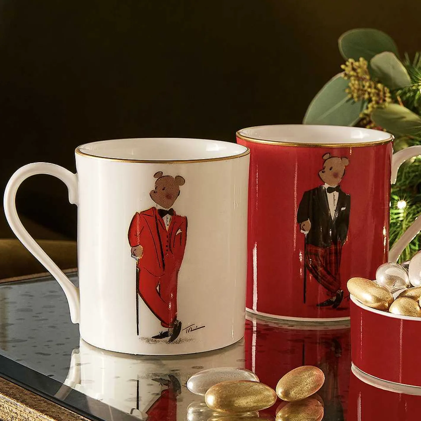 A Meticulously Crafted Work Of Art, This Fine Bone China Mug In Pristine White, Adorned With A White Gold Gilded Touch, Presents The Distinguished Figure Of Hal The Bear In Snappy Red Suit.