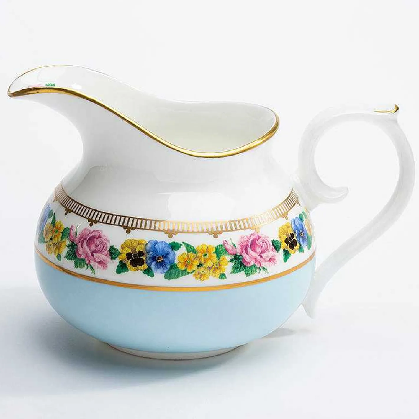 This Cream Jug Has Been Handcrafted From English Fine Bone China And Matches A Cornflower Blue Background With Delicately Hand-Painted Pansies, Primulas, Carnations And Albertine Roses