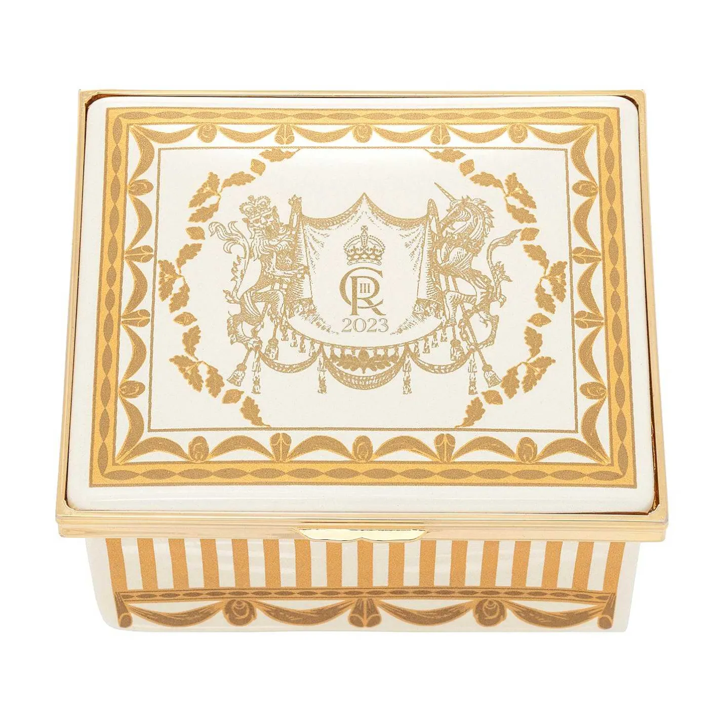 This Enamel Musical Box Has Been Handcrafted In The Heart Of England By Halcyon Days Artisans. It Is Beautifully Hand Decorated In Gold To Reflect The Grandeur And Majesty Of The Coronation Of King Charles Iii. At Its Centre Is The King’S Royal Cypher Supported By The Crowned English Lion And Scottish Unicorn Of The Royal Coat Of Arms.