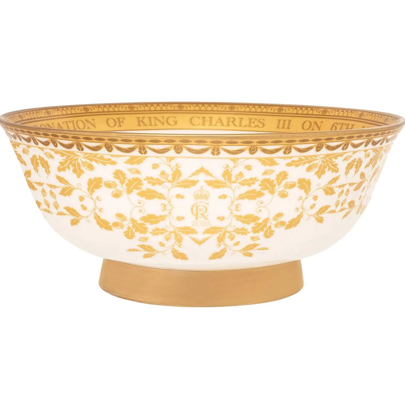 This English Fine Bone China Commemorative Presentation Bowl Has Been Handcrafted In The Heart Of England By Halcyon Days Artisans. It Is Beautifully Hand Decorated In Gold To Reflect The Grandeur And Majesty Of The Coronation Of King Charles Iii. At Its Centre Is The King’S Royal Cypher Supported By The Crowned English Lion And Scottish Unicorn Of The Royal Coat Of Arms.